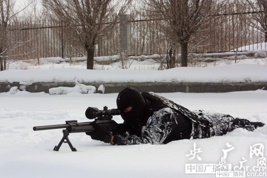 飛虎突擊隊員在雪地在雪地進行雪地狙擊偽裝訓練(央廣網(wǎng)發(fā) 張孝成 攝)