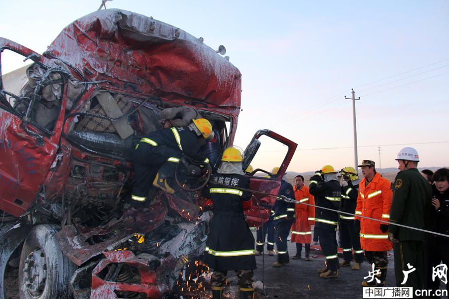 央廣網(wǎng)蘭州1月3日消息(記者焦健 通訊員龔晨)3日早晨7點(diǎn)27分,金武公路趙家溝段兩輛拉運(yùn)化危險(xiǎn)品的車(chē)輛發(fā)生追尾,一名駕駛員被困,金昌市公安消防支隊(duì)指揮中心接到報(bào)警后迅速趕往現(xiàn)場(chǎng)營(yíng)救.發(fā)生追尾的兩輛事故車(chē)輛均為滿載30噸燒堿溶液的槽罐車(chē),由于碰撞前車(chē)注液管破裂,管內(nèi)燒堿溶液大量泄漏至路面并已結(jié)冰;后車(chē)駕駛室嚴(yán)重變形,駕駛員被困,但沒(méi)有發(fā)生燒堿泄漏。