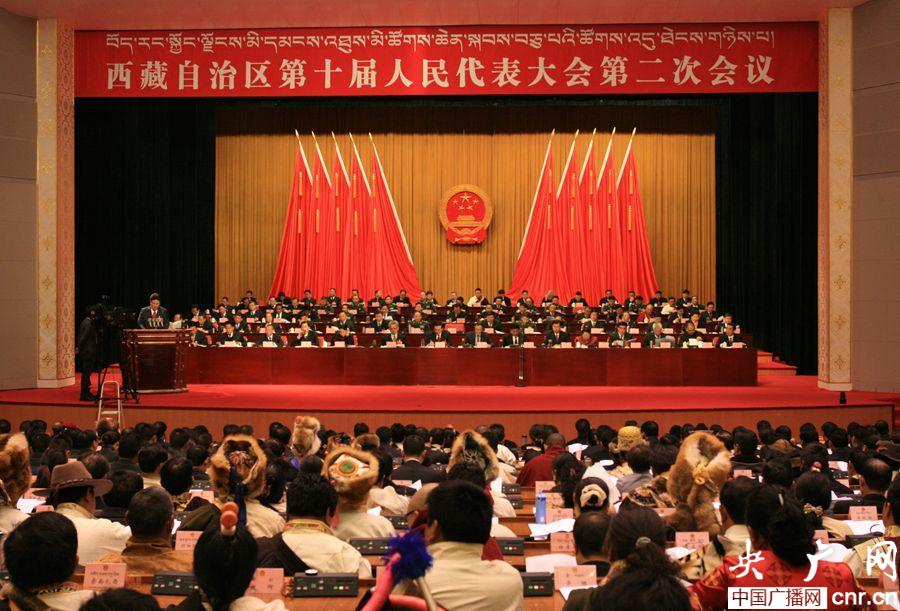 西藏自治區(qū)十屆人大二次會(huì)議今日開幕洛桑江村作政府工作報(bào)告(央廣網(wǎng)記者 普布次仁 攝)
