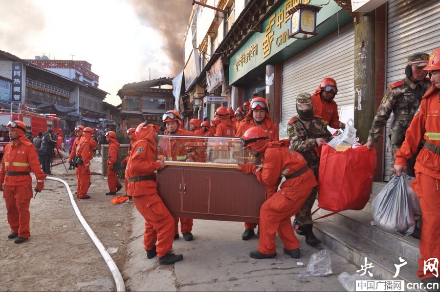 古城大火從一民房引發(fā)后,當?shù)販缁鹆α烤o急進行了撲救,但由于古城房屋均以木結(jié)構(gòu)建筑為主,大火很快蔓延到古城大部分房屋,并直接威脅緊鄰古城的重點景區(qū)大佛寺的安全。為阻止大火燒毀古寺,迪慶森林大隊積極請領(lǐng)任務(wù),擔負保護大佛寺安全的任務(wù)。他們迅速阻止官兵清除古寺周邊建筑木質(zhì)可燃物,降低大火蔓延強度,并古城外圍架設(shè)森林消防水泵,向大佛寺遠距離輸水撲打蔓延到古寺周邊的大火。同時,積極抽調(diào)官兵轉(zhuǎn)移少數(shù)民族受災(zāi)群眾,幫助他們搶運屋內(nèi)物資,提供簡單醫(yī)療服務(wù)。