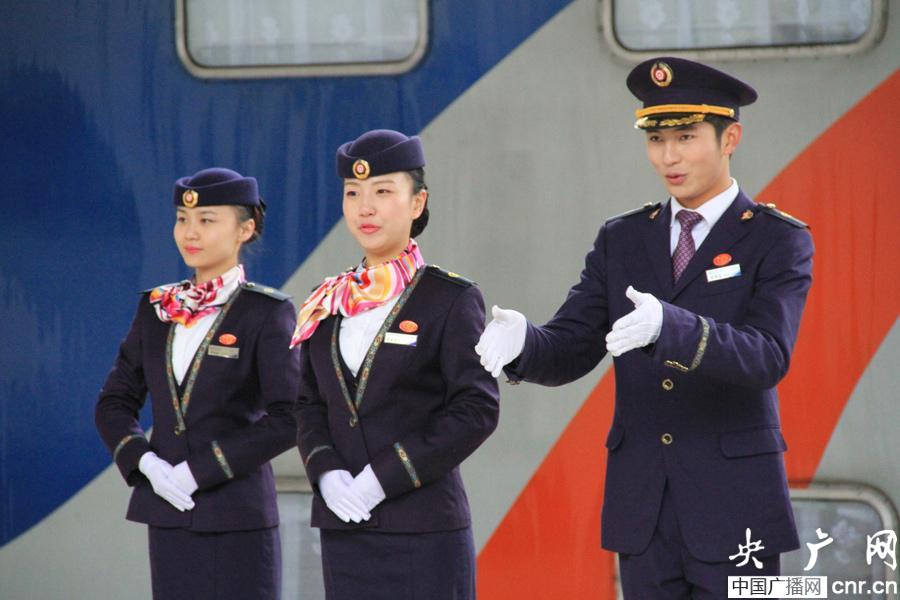 列車員展示文明服務(央廣網記者 李健飛 攝)