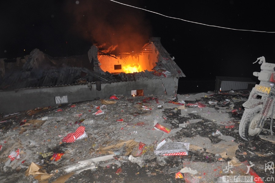 凌晨4時18分,消防官兵到達現(xiàn)場后,發(fā)現(xiàn)煙花廠上空火光沖天,爆炸聲連續(xù)不斷,現(xiàn)場一片混亂。現(xiàn)場指揮員迅速命令進行火場偵查及詢問在場知情人,經(jīng)偵查及詢問知情人得知:漢江煙花爆竹廠內部共分5個梯段,爆炸部位位于漢江煙花爆竹廠第三梯段煙花爆竹加工車間,車間內存放大量煙花爆竹,劇烈的爆炸致使加工車間5間廠房夷為平地,北側圍墻被沖擊波掀翻,周圍50米內居民樓房玻璃大量碎裂。