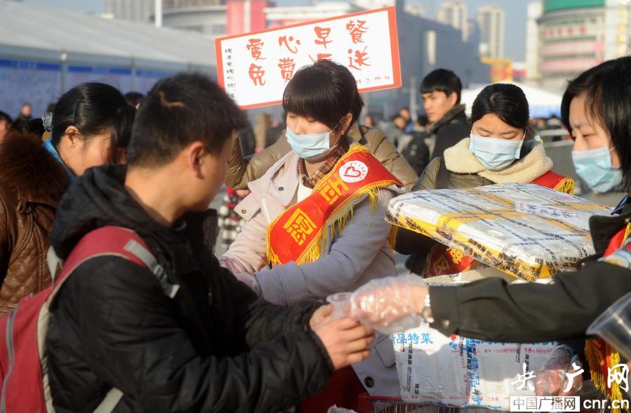 合肥市瑤海城管在火車站設(shè)立免費早餐發(fā)放點,溫暖旅客歸鄉(xiāng)路(央廣網(wǎng)發(fā) 解琛 攝)