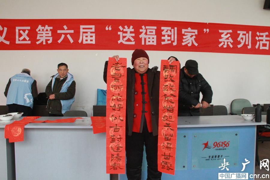 央廣網(wǎng)北京1月24日消息(記者李文蕊 通訊員李明磊)1月23日是中國傳統(tǒng)的小年兒,值此新春佳節(jié)之際,北京順義文委與北石槽聯(lián)手在中灘營村開展小年“送福到家”活動,F(xiàn)場一片熱鬧景象,來自當?shù)匚幕^的6位書法家一刻不停,為村民寫了300多副春聯(lián)和“!弊郑簧俅迕褚藢β(lián)還覺得不夠,請求書法家們再多贈幾個“福”字。