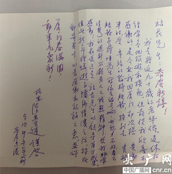9旬老華僑寫給廈門火車站的感謝信(央廣網(wǎng)發(fā) 劉薇 攝)