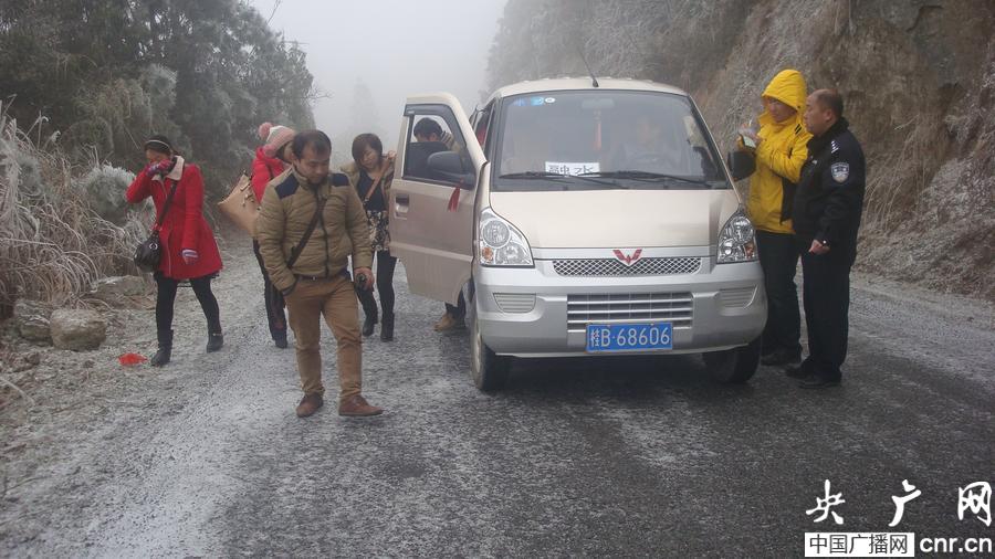 柳州融水縣桿洞鄉(xiāng)高強(qiáng)村打鳥(niǎo)坳路段路面結(jié)冰,交警轉(zhuǎn)移乘客(央廣網(wǎng)發(fā) 曹媛媛攝)