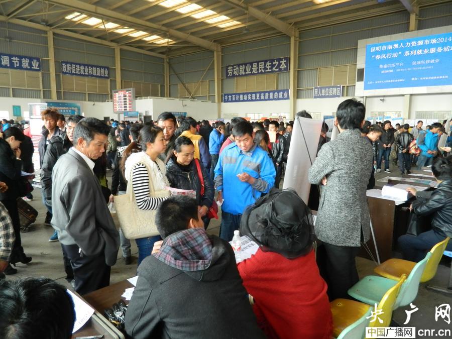 昆明市南壩人力資源招聘市場這幾天人頭攢動、非常熱鬧,恰逢春節(jié)后集中用工和求職的高峰期,每天都有近5000人來找工作,而招工單位也超過了450家,共提供了3800多個(gè)崗位,工種以服務(wù)員、洗碗工、廚師、保安等服務(wù)類為主。二十歲出頭的謝興周11號這天第一次來到招聘市場,他的意向工作是司機(jī),他認(rèn)為隨著物價(jià)上漲,去年大概2800元的工資今年應(yīng)該至少漲到3000元才能達(dá)到心理預(yù)期。