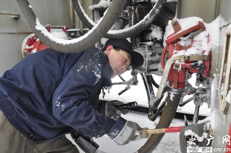 檢修人員正對(duì)機(jī)車管路進(jìn)行檢測(cè)(央廣網(wǎng)發(fā) 白世平 攝)