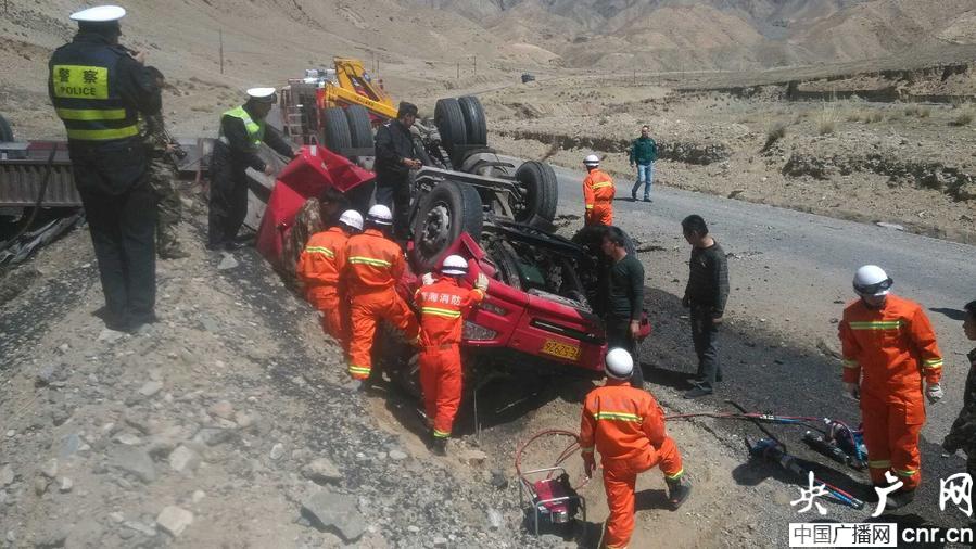 央廣網(wǎng)西寧4月14消息(記者 葛修遠(yuǎn) 通訊員 焦昆)今天中午11時(shí)許,一輛載煤的33噸巨大半掛貨車行駛至青海省海南州共和縣龍羊峽國(guó)道32公里處時(shí),在一處急轉(zhuǎn)彎發(fā)生側(cè)翻,沖到路旁的水溝中,車上一名司機(jī)被困,共和縣消防大隊(duì)的救援官兵經(jīng)過半小時(shí)的緊張救援,成功救出被困的男性司機(jī)。