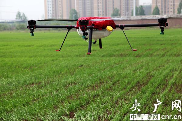 用于噴灑農(nóng)藥的農(nóng)用植保油動(dòng)無(wú)人直升機(jī)飛行在田間進(jìn)行現(xiàn)場(chǎng)演示。 (央廣網(wǎng)發(fā) 倪樹斌攝)