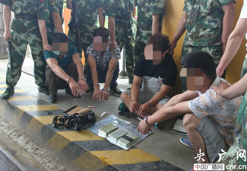 4月24日下午16時,官兵在南友高速崇左收費站入口處成功攔截一輛涉嫌販毒的廣東牌照本田轎車,當(dāng)場從車內(nèi)一黑色皮包里搜出3塊高純度海洛因,共重1158.4克, 4名犯罪嫌疑人被一舉抓獲。