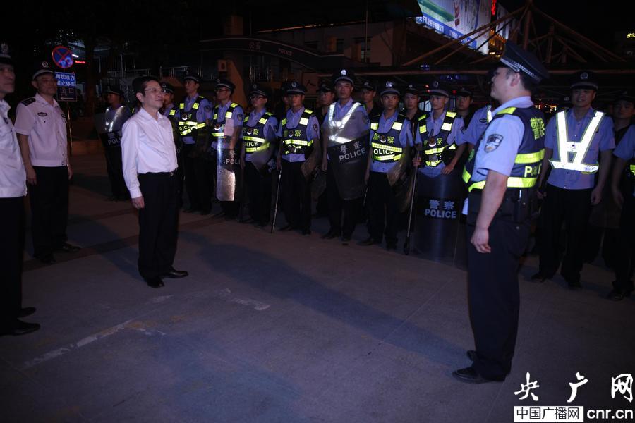 19:35分,在南寧火車站出站廣場地,高雄檢查了報警點、運營控制中心和武警指揮點等,并現(xiàn)場進行維穩(wěn)處突應(yīng)急演練,集結(jié)各地處突警力。在15分鐘內(nèi),應(yīng)急演練共集結(jié)車站公安派出所執(zhí)勤崗、鐵路交警、鐵路公安特警、南寧特警、交警、巡警、110指揮中心、華強派出所、朝陽派出所、興寧派出所、唐山派出所等警力84人。