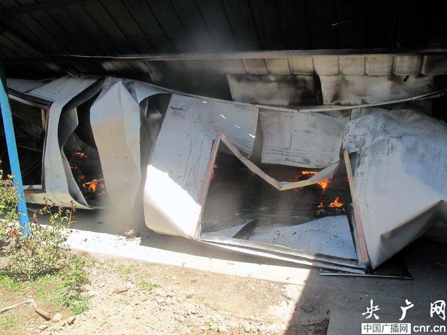當?shù)叵啦块T接警后出動輛水罐消防車和10名消防官兵趕赴現(xiàn)場處置。由于廠房里堆滿了純凈水桶等易燃物,整個廠房猛烈燃燒,已有兩間頂部被燒穿,并不斷向毗鄰的倉庫蔓延。消防戰(zhàn)士從不同方位打壓火點、消滅明火,將險情成功排除。
