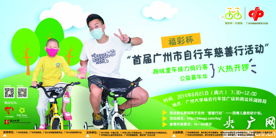 央廣網(wǎng)廣州5月22日消息(記者何偉奇 通訊員文燕媚)經(jīng)廣州市政府同意,廣州市慈善會(huì)、廣東省千禾社區(qū)公益基金會(huì)、拜客廣州將于2014年6月21日上午,在廣州大學(xué)城自行車館廣場(chǎng)及環(huán)湖路段舉辦福彩杯首屆廣州市自行車慈善行活動(dòng),為廣州市慈善會(huì)“愛(ài)蕾行動(dòng)”——困境兒童救助計(jì)劃籌集善款。