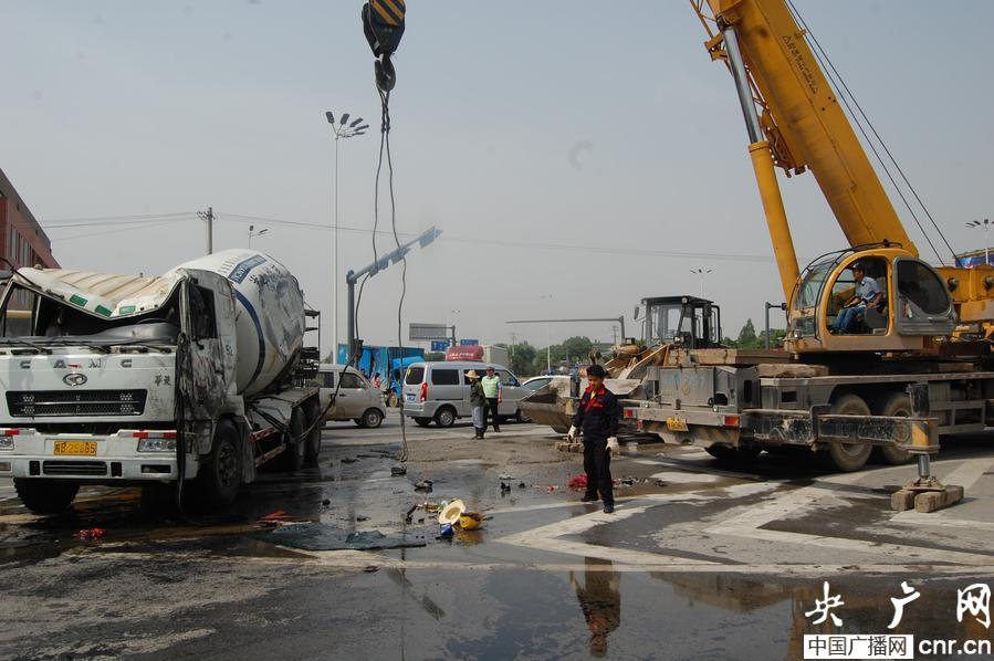 根據(jù)現(xiàn)場初步勘查,事故極有可能是攪拌車駕駛?cè)藶楸茏層肄D(zhuǎn)大貨車緊急向右打方向,致使其側(cè)翻后撞到紅燈等候的1輛轎車和3輛電瓶車,造成電動車上4人受傷、攪拌車駕駛?cè)耸軅,車輛損壞嚴(yán)重。現(xiàn)場汽油泄漏嚴(yán)重,經(jīng)過交警、消防共同努力,通過水槍沖洗、疏散群眾等方法,稀釋了空氣中汽油含量,預(yù)防了烈日天氣下火災(zāi)發(fā)生。