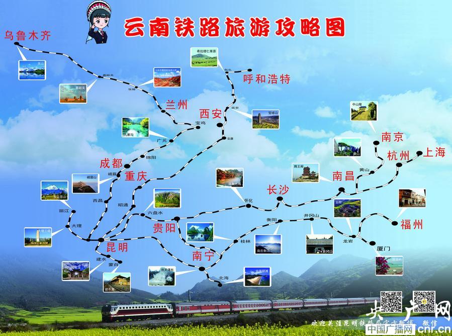 通過(guò)這個(gè)圖,旅客就可以知道鐵路沿線有什么景點(diǎn),需要到哪個(gè)火車站,做什么車!氨热绲进P凰古城,從昆明出發(fā)坐T62次旅客列車到懷化站下車,就可以到了,”據(jù)昆明火車站工作人員楊坤明介紹,“下午18時(shí)49分從昆明站上車,第二天中午就到北海了,坐火車去看海其實(shí)真的很方便!