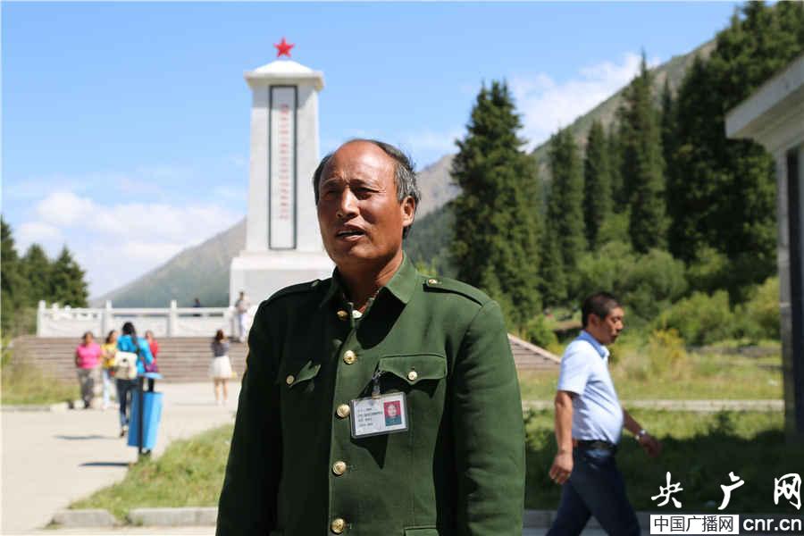 陳俊貴為游客講述修筑天山公路英勇犧烈士的故事(央廣網(wǎng)記者 張雷 攝)