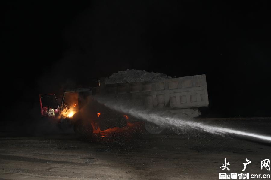 2時(shí)25分,黔江消防官兵抵達(dá)現(xiàn)場(chǎng)后發(fā)現(xiàn),一輛重型貨車(chē)停在工地道路上,駕駛室內(nèi)正冒著滾滾濃煙,空氣中彌漫著刺鼻的焦味,赤紅的火焰正燃燒著輪胎,時(shí)而發(fā)出噼啪聲響,濃濃的黑煙從汽車(chē)底部向外冒出,駕駛室火勢(shì)正在擴(kuò)大。一旦火勢(shì)蔓延到油箱后果將不堪設(shè)想,針對(duì)現(xiàn)場(chǎng)情況,消防官兵立即出一支水槍直擊著火點(diǎn),在泡沫水槍的攻勢(shì)下,10分鐘后貨車(chē)的火勢(shì)很快得到控制,為防止復(fù)燃,消防官兵對(duì)貨車(chē)冒煙部位進(jìn)行噴水冷卻。