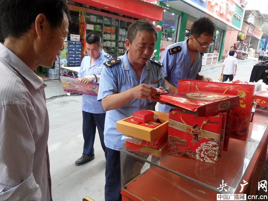 執(zhí)法人員當(dāng)場(chǎng)查扣“三無(wú)”月餅(鄭聰明 攝)(央廣網(wǎng)記者 陳庚 攝)
