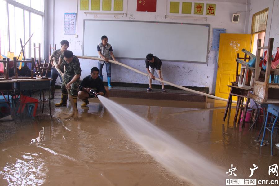 巫溪縣消防大隊官兵一大早就趕到了學(xué)校,消防官兵首先對學(xué)校食堂、教室、宿舍進行了清洗。記者看到,消防官兵沖刷過的地面比原來干凈了許多,消防官兵和學(xué)校工作人員正拿著掃把和水槍,在教室內(nèi)一邊沖洗一邊刷地,將教室一間一間的沖洗干凈。