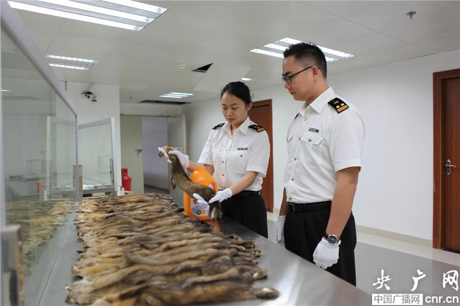 深圳羅湖海關(guān)人員此次共計(jì)繳獲水貂皮43條(央廣網(wǎng)記者 鄭柱子 攝)