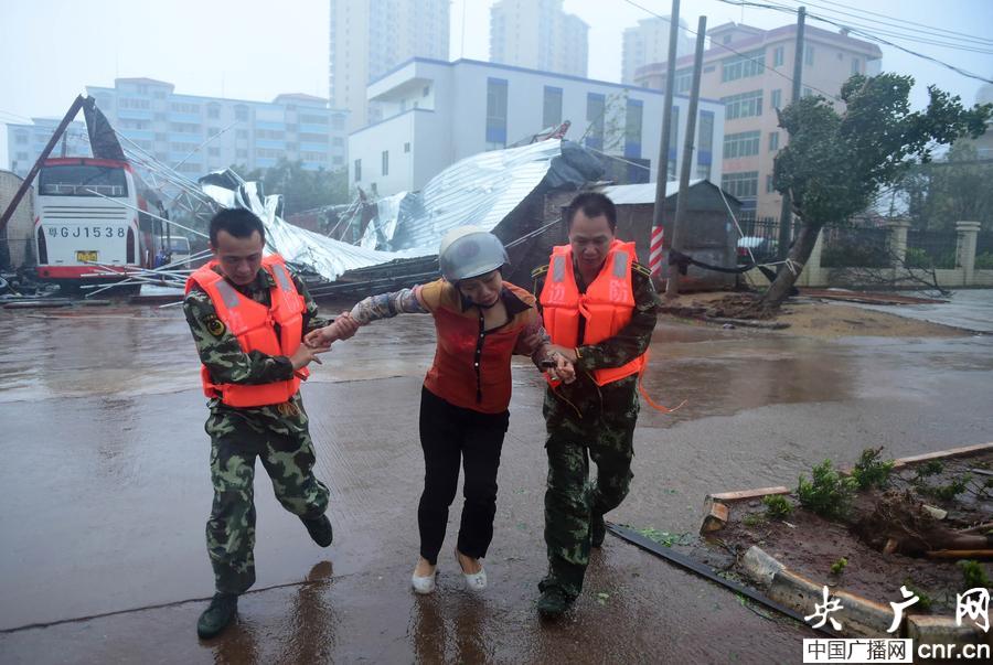 央廣網(wǎng)湛江9月16日消息(記者鄭澍 通訊員廖鍵 錢夢秋 攝影廖鍵 錢夢秋)據(jù)氣象部門消息,今年第15號臺風(fēng)“海鷗”已于16日12時45分,在廣東湛江徐聞縣南山鎮(zhèn)五里村沿海地區(qū)二次登陸,登陸時中心最大風(fēng)力13級。 9月16日下午15時左右,廣東邊防總隊湛江支隊徐聞邊防大隊官兵在海安大道巡邏搜救時,在一處被吹倒的鐵皮房內(nèi)發(fā)現(xiàn)了一名50歲左右的張姓婦女正躲在角落哭泣;邊防官兵立刻將其救回巡邏車,并將其送回家中。該婦女一邊擦著眼淚一邊不停的感謝道:“我已經(jīng)在里面待了十幾分鐘了,如果不是你們,真不知道該怎么辦”。據(jù)悉,該婦女因為不放心老父親一人在家,特意從夫家騎摩托車趕回,但是因風(fēng)雨太大,無奈只能躲進了路邊的鐵皮房中,卻沒有料到,臺風(fēng)將鐵皮房刮倒,所幸遇到邊防官兵巡邏將其救回。