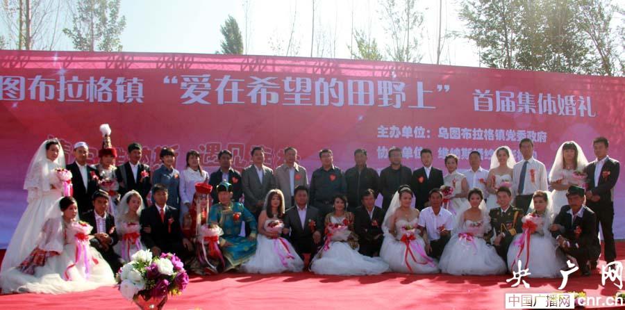 集體婚禮現(xiàn)場,在浪漫音樂的輕奏下,鮮艷的國旗被藍(lán)天勾勒出美麗的輪廓,維、蒙、漢、哈、回5個(gè)民族12對(duì)新人和2對(duì)金婚夫婦手拉手在國旗下宣誓,放飛和平鴿,攜手倡導(dǎo)文明,守護(hù)和諧家園,祝福祖國安定和諧。現(xiàn)場還表演了《博爾塔拉我的愛》大型集體舞和傳統(tǒng)麥西萊甫舞蹈,婚宴則是用新疆民族風(fēng)味的大鍋?zhàn)ワ執(zhí)娲,充分體現(xiàn)了節(jié)儉辦婚禮。
