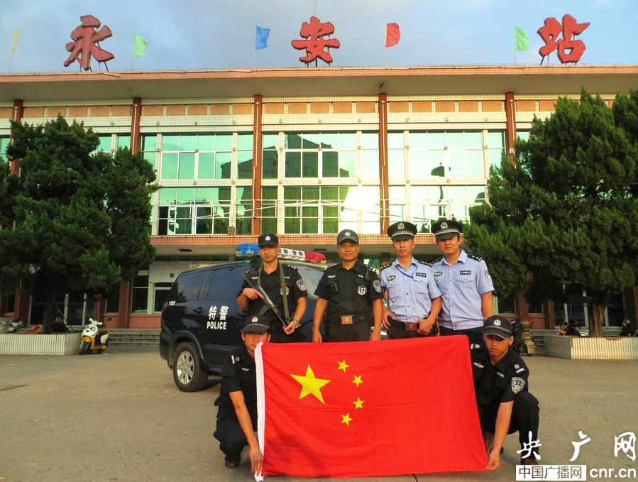 圖為永安車站派出所民警與國旗合影(央廣網(wǎng)記者 葛朝興 攝)