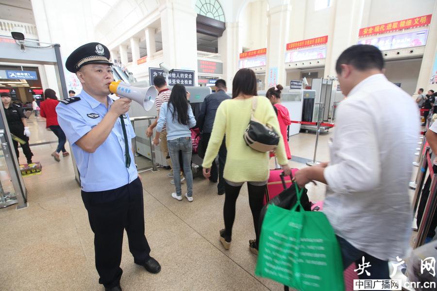9月29日,武漢鐵路公安處客車刑警大隊的偵查員們來到漢口火車站,在候車室向旅客面對面地講解出行注意事項: