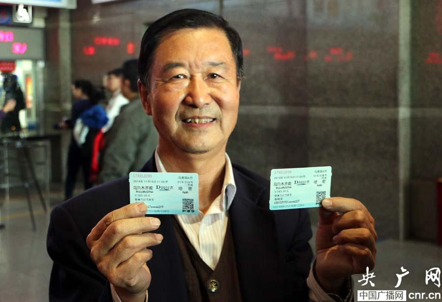上午11點(diǎn)整,68歲的烏魯木齊市民張長齡老人在烏魯木齊南站售票窗口買到了11月16日首發(fā)列車的第一張票。