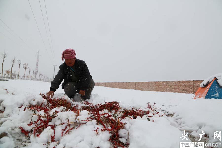 暴雪覆蓋正在晾曬的辣椒(央廣網(wǎng)記者 吳卓勝 攝)