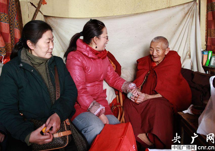 在繞賽社區(qū)的居民大院中,年過(guò)八十高齡的益西卓瑪老人告訴記者,這些工作隊(duì)隊(duì)員正是在挨家挨戶(hù)為社區(qū)內(nèi)的孤寡老人送東西。益西卓瑪老人緊握起工作隊(duì)的隊(duì)員的雙手對(duì)記者說(shuō):“考慮到現(xiàn)在年底將至,氣溫急降,這些孩子們特意為我們這些無(wú)依無(wú)靠的老人們精心購(gòu)置棉絮被、毛毯、酥油、糌粑這些過(guò)冬的生活用品。平時(shí)里他們?yōu)槲覀冝k的特殊門(mén)診卡給我們徹底解決了看病的問(wèn)題,又在過(guò)年前給我們添置年貨,他們就像我們的孩子一樣親!