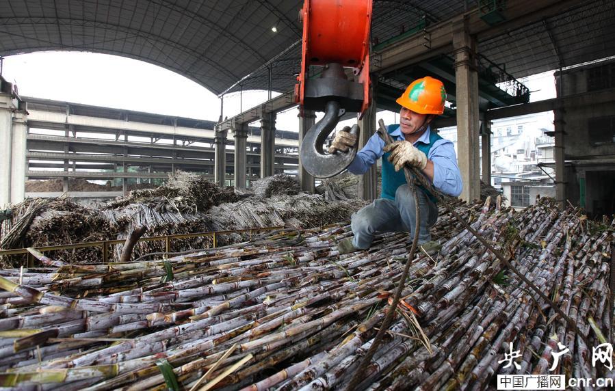 在柳州市柳城縣鳳山糖廠,一名工人在吊裝甘蔗(央廣網(wǎng)發(fā) 鄧克軼 攝)