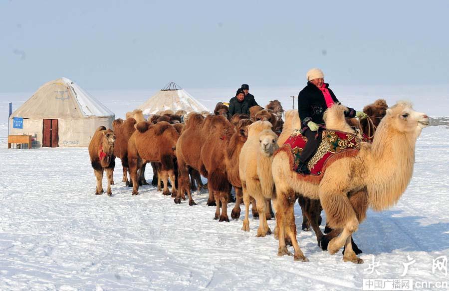 牧民趕著駱駝隊來到冰雪節(jié)現(xiàn)場(丹江水?dāng)z)(央廣網(wǎng)記者 張雷 攝)