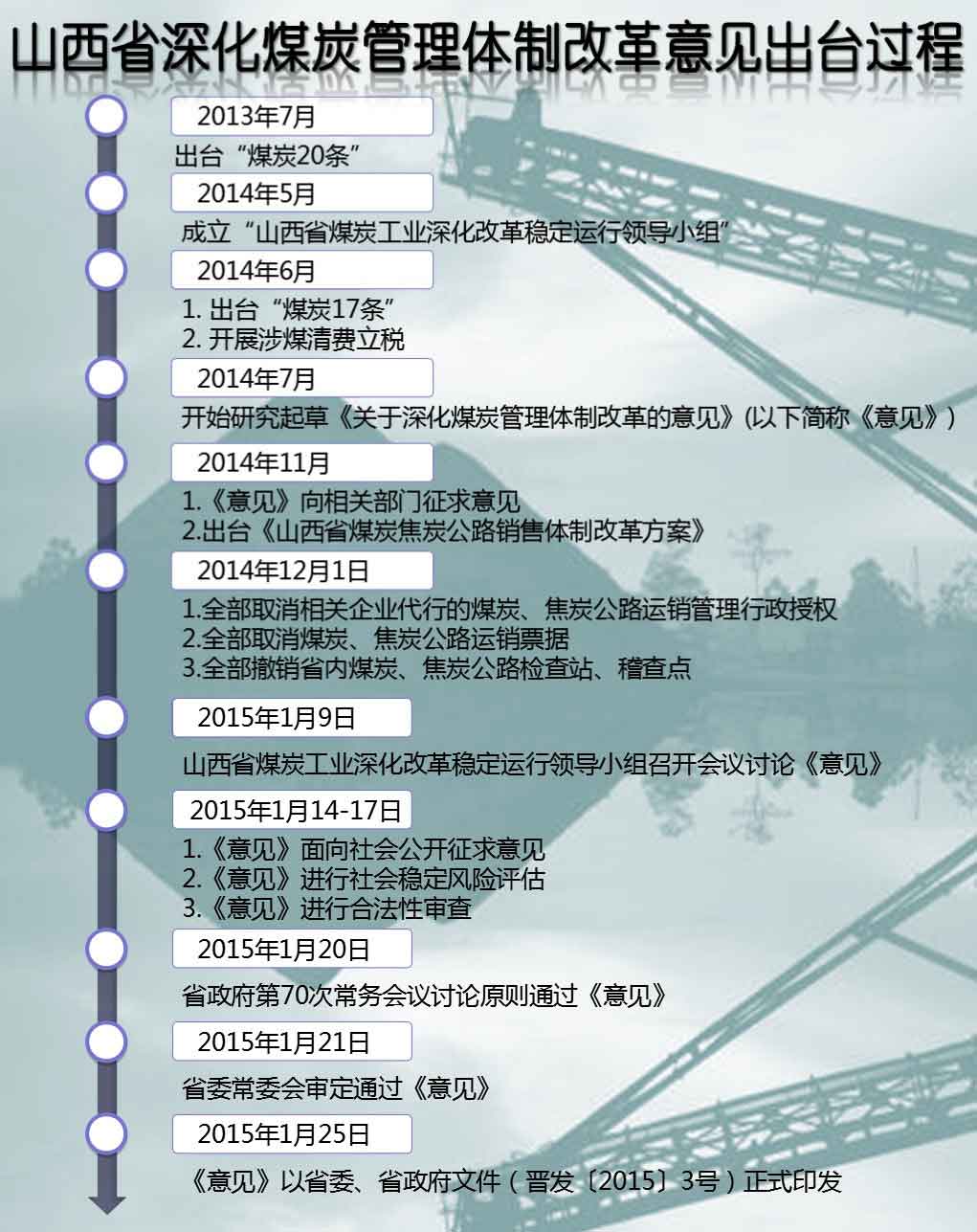 對(duì)此,山西省委省政府理清思路,有序改革,經(jīng)環(huán)環(huán)相扣。2013年出臺(tái)了“煤炭20條”,2014年上半年出臺(tái)了“煤炭17條”,下半年在全國率先清理涉煤收費(fèi),在年底全面展開了煤焦公路運(yùn)銷體制改革和資源稅從價(jià)計(jì)征改革,這一系列措施形成了促進(jìn)煤炭改革發(fā)展的政策集成優(yōu)勢(shì),社會(huì)各方對(duì)此給予高度關(guān)注、熱切期待、普遍認(rèn)同和廣泛支持。國家相關(guān)部門一致認(rèn)為山西省推動(dòng)煤炭管理體制改革“必將為全國煤炭工業(yè)平穩(wěn)健康發(fā)展發(fā)揮重要的示范作用”。