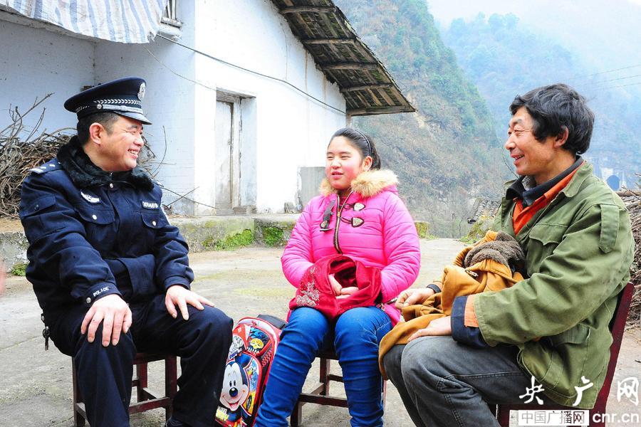 到鐵路沿線宣傳走訪中,巴山警務(wù)區(qū)民警范雪艷給山區(qū)貧困留守兒童王春蘭帶去了自己為她買的書包和一套新衣服,與回到家的孩子父親一起談“小春蘭”的學(xué)習(xí)情況。(央廣網(wǎng)記者 雷愷 攝)