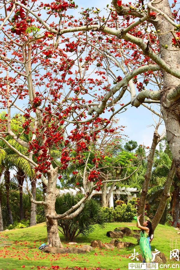 近日,隨著春回大地,氣溫回暖,三亞南山景區(qū)內(nèi)外木棉樹的花朵在枝頭次第綻放,格外鮮艷,大片的木棉花遠遠望去,就像燃燒的火焰,格外美麗,吸引了鳥兒和松鼠前來享受“花蜜大餐”,成為一道游人爭相拍照的美景。(陳文武 攝)