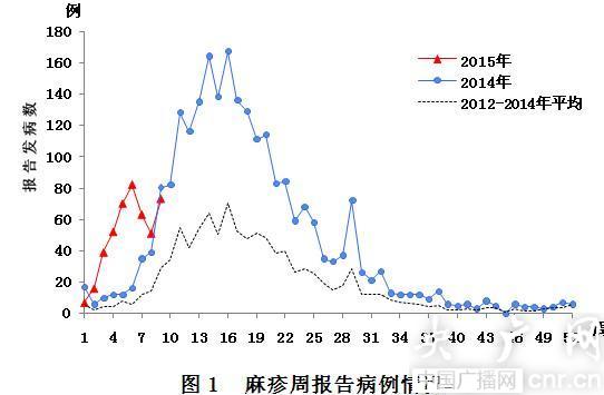 麻疹周報告病例情況 北京市衛(wèi)生計生委紀晉文制(央廣網記者 李文蕊 攝)