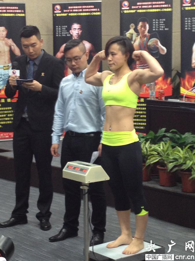 本次賽事設(shè)有自由搏擊、綜合格斗、古泰拳麻繩戰(zhàn)和女子拳擊四種對決。圖為我國全國女子拳擊冠軍徐春燕,與她對決的是擁有一條S1金腰帶泰國女拳王鐵蓮花優(yōu)罕·愛麗莎。(央廣網(wǎng)記者 何偉奇 攝)