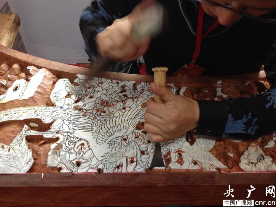 博覽會現(xiàn)場展示的紅木雕刻制作工藝(央廣網記者 何偉奇 攝)