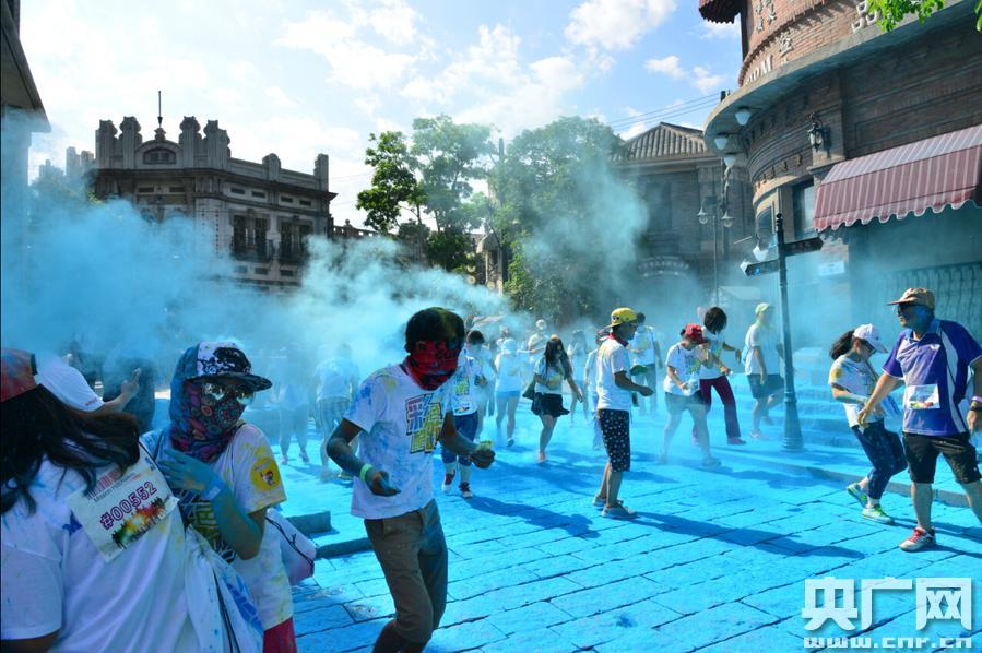 當(dāng)天上午9點(diǎn),在海口觀瀾湖華誼馮小剛電影公社影人星光大道路口正式開跑,同時(shí)在電影公社“1942街”鐘樓廣場、大型攝影棚拍攝區(qū)、觀瀾湖、蘭桂坊、?谑V湖、觀瀾湖火山巖礦溫泉500米龍脊長廊處都設(shè)有人工噴彩點(diǎn),讓參與者除了跑出夏日激情,更能感受到觀瀾湖的魅力與活力。特別在電影公社“1942街”鐘樓廣場設(shè)有“藍(lán)色”人工噴彩,一條條長龍似的青年隊(duì)伍跑過狂噴的彩粉時(shí),頓感頭頂上的藍(lán)天和地上變藍(lán)的青石板路已經(jīng)連成一線,傻傻分不清楚,美得掉渣。