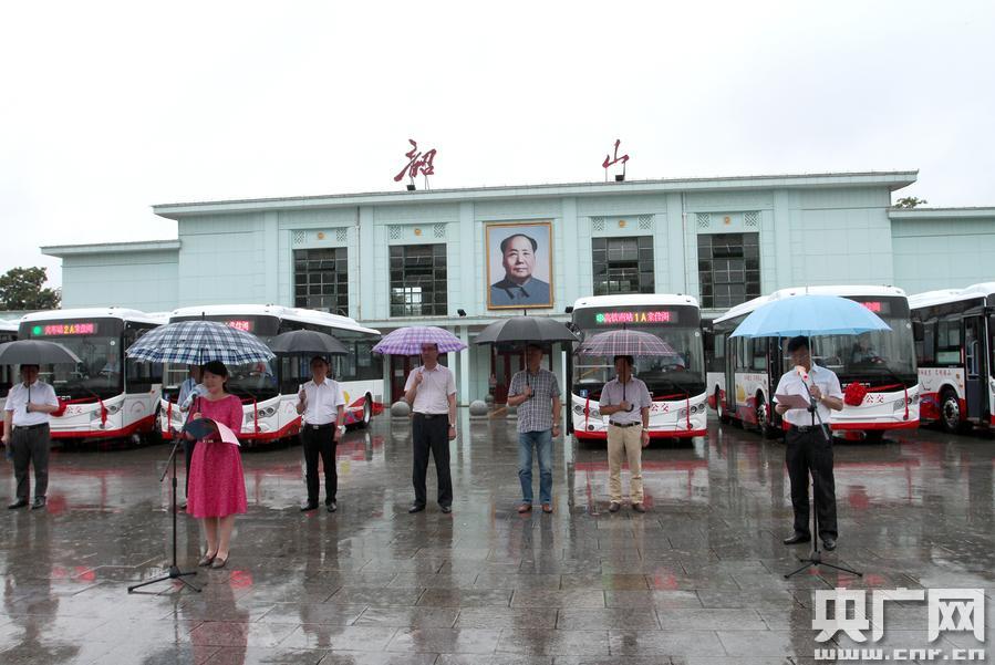 6月8日,韶山迎來全省首條純電動城鄉(xiāng)公交線路1、2路的正式開通運營,圖為開通儀式現(xiàn)場(央廣網(wǎng)發(fā) 賀湘云 攝)