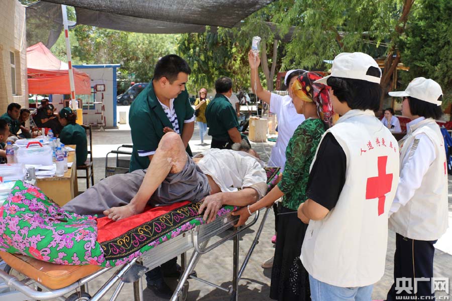 皮山縣一中是受災(zāi)群眾的安置點(diǎn),這里除搭建居住帳篷外還提供醫(yī)療救助,解放軍十八醫(yī)院心內(nèi)科醫(yī)生楊兵介紹:“我們目前開展是8張床位,根據(jù)病人的情況還可以增加,比如輕一點(diǎn)的病人不需要留觀的,我們簡單處理過后再把他們分流,但是特別重的我們就轉(zhuǎn)上級醫(yī)院進(jìn)行進(jìn)一步治療!