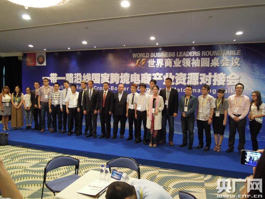 主辦方與坐鎮(zhèn)對接臺的跨境電商機(jī)構(gòu)企業(yè)代表合影(央廣網(wǎng)發(fā) 呂貝娜 攝)