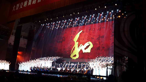 《和平頌》的音樂部分極具特色。六首原創(chuàng)歌曲、五首抗戰(zhàn)歌曲、十七段舞蹈音樂,以及大量的朗誦背景音樂,均緊扣世界反法西斯戰(zhàn)爭和中國反法西斯戰(zhàn)爭兩大主題,既突出世界各國的異域音樂風(fēng)情,又強(qiáng)調(diào)了中國民族音樂的傳統(tǒng)特色,同時(shí)各部分在藝術(shù)表現(xiàn)上達(dá)到和諧統(tǒng)一。比如,舞蹈《奧林匹克》中采了古希臘的音樂元素,以一些非常古老的、原生態(tài)的音樂素材為原型進(jìn)行藝術(shù)創(chuàng)作,體現(xiàn)出濃郁的古希臘音樂風(fēng)格。在作品的各個(gè)章節(jié)中,使用二胡、竹笛、琵琶、中阮、古箏、板鼓等中國民族樂器,展現(xiàn)中國傳統(tǒng)音樂的感染力。如第三幕,在交響樂隊(duì)的襯托下,竹笛、琵琶作為領(lǐng)奏,能讓觀眾感受到晉冀魯豫抗日根據(jù)地的濃郁地域色彩和偉大的軍民抗戰(zhàn)情懷。又如第四幕中的“水袖”,板鼓的加入,使水袖音樂更加民族化,與青衣的舞蹈更為融合,展現(xiàn)出民族音樂和民族舞蹈的特點(diǎn)。整場演出的音樂風(fēng)格變幻,卻能夠保持藝術(shù)表現(xiàn)的和諧統(tǒng)一。