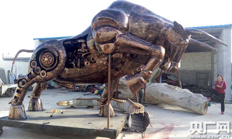 提及設(shè)計初衷和制作過程,景逸雕塑負責(zé)人許高鵬告訴記者:“因為我們知道江蘇華西村有一個金牛,美國華爾街也有一個牛。我們想呼圖壁縣本來就是中國牛鄉(xiāng),以牛這個主題,我們討論了一下,最后定下來就是一種拓荒牛的造型。完了之后我們就去廢品收購站買了許多廢鐵,廢鋼板之類的材料。從牛蹄開始,所有的鋼板都是我們用手工用榔頭一下一下敲出來的。當時就想用廢舊零件去做,一方面是廢物利用,一方面是節(jié)能環(huán)保!