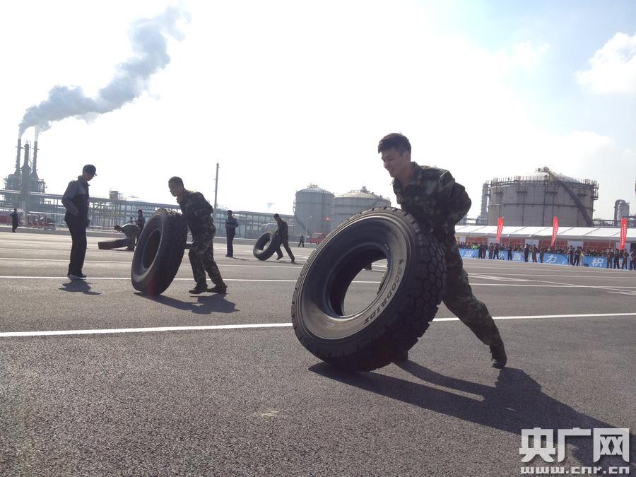 個人體能競賽環(huán)節(jié),參賽隊員在搬160斤重的輪胎