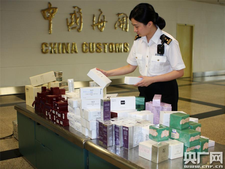 廈門海關(guān)查獲母女?dāng)y帶263件化妝品進(jìn)境案(江冰 攝)