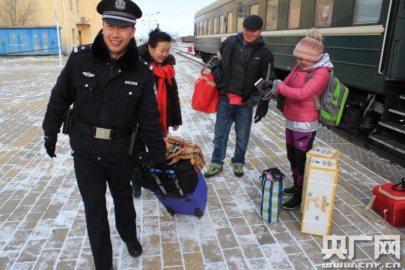 央廣網(wǎng)二連浩特11月26日消息(記者黎政祥 吳弘樂 通訊員劉敏)近日,內(nèi)蒙古多地普降瑞雪,大幅降溫。位于中蒙邊境的二連浩特市氣候尤其惡劣,大雪天氣持續(xù)已達3天,氣溫連續(xù)走低,下降至零下20多度。二連浩特車站派出所民警路永勝在接蒙古國烏蘭巴托-中國二連浩特的682次國際旅客列車時,熱心幫助蒙古國旅客提行李,并用雙語服務中外乘客。路永勝是客運警長,為了更好的服務外籍旅客,他努力學習,掌握了蒙、英兩國語言。二十多個春秋,他迎來和送走了一批又一批的旅客。