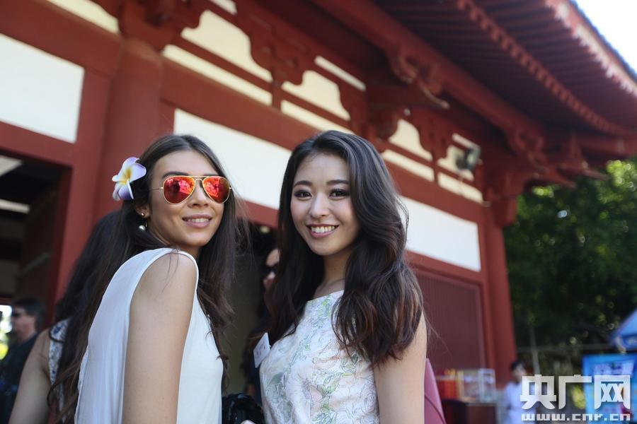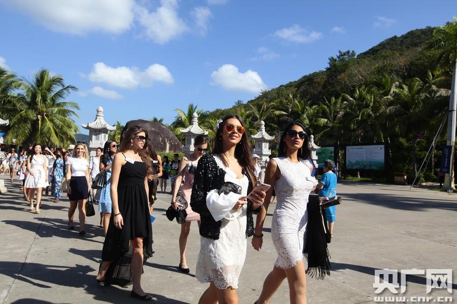 在南山景區(qū),佳麗們乘坐“小火車”游覽了海上觀音、南山寺、金玉觀音、三十三觀音堂等景點。佳麗們有說有笑,還時不時拿出手機自拍留念。佳麗們高挑的身材十分搶眼,每到一處都會引來眾多游人圍觀拍照,她們也十分隨和,并熱情的用中文“你好”向游客打招呼。